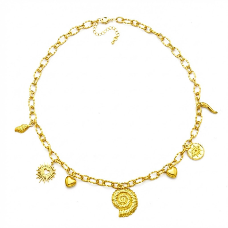 Collier "charms" avec ses 10 éléments, sa chaîne et son fermoir homard dorés à l'or fin 18 carats. Dans l'ordre : cœur rouge, cerises, soleil rayonnant, ziconium facetté, grand cœur, cadenas, œil turc, ziconium sur...