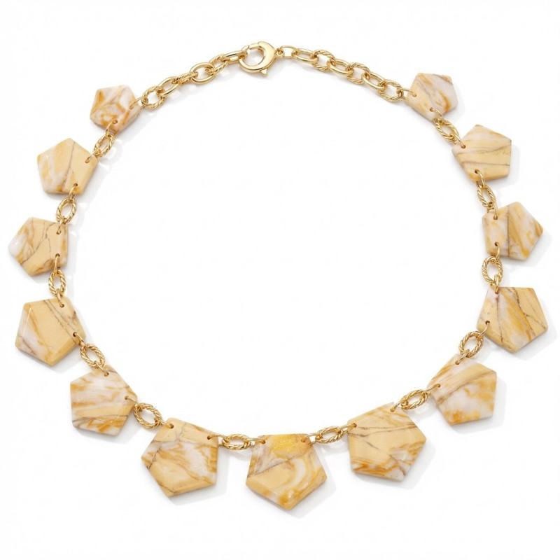 Collier fait de cabochons en polymère couleur beige, jaune or et gris clair.