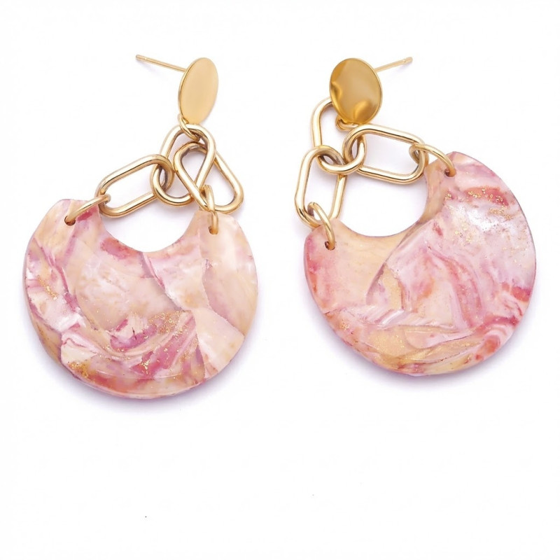 Boucles d'oreilles en polymère et en forme de demi-lune. Couleurs or et crême. Les chaînes et les clous sont en acier inoxydable.