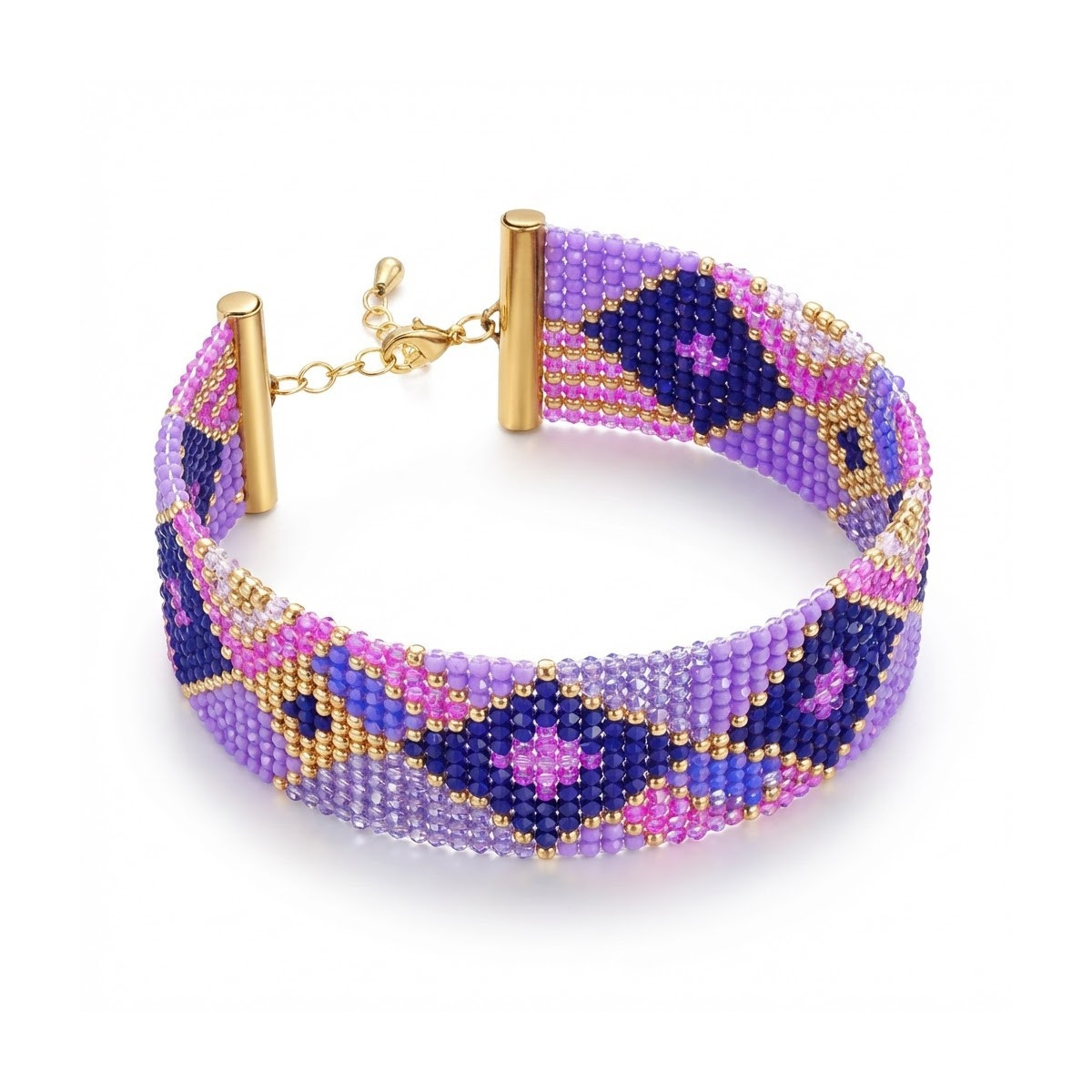 Bracelet tissé au métier à tisser en perles de verre "Miyuki" couleurs bleu, violet, rose, blanc et or. Le fermoir et la chaîne d'extension sont en acier inoxydable couleur or.