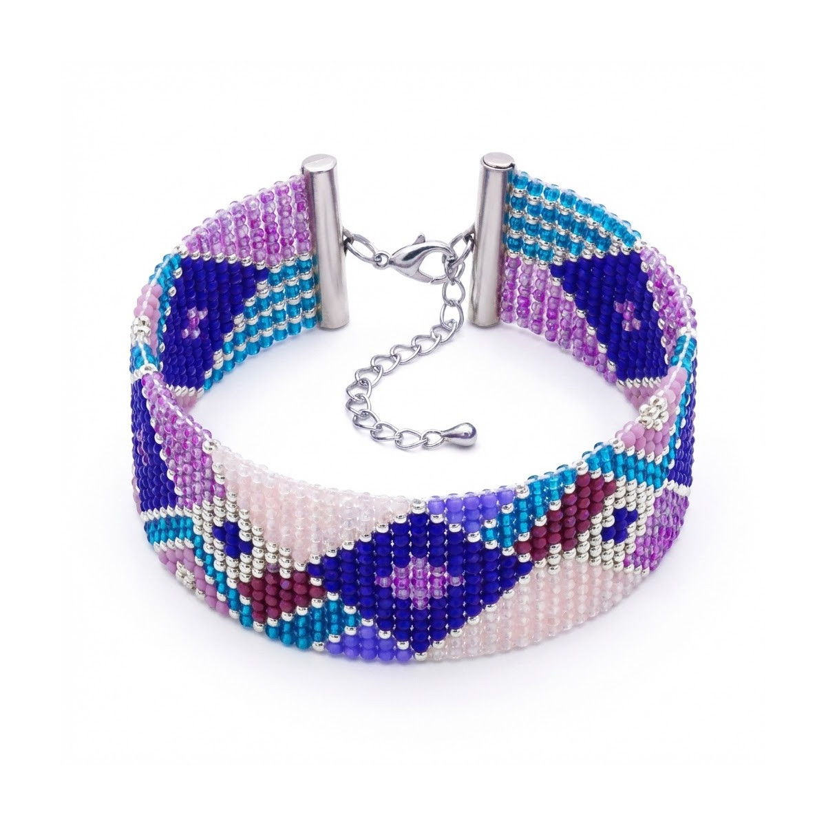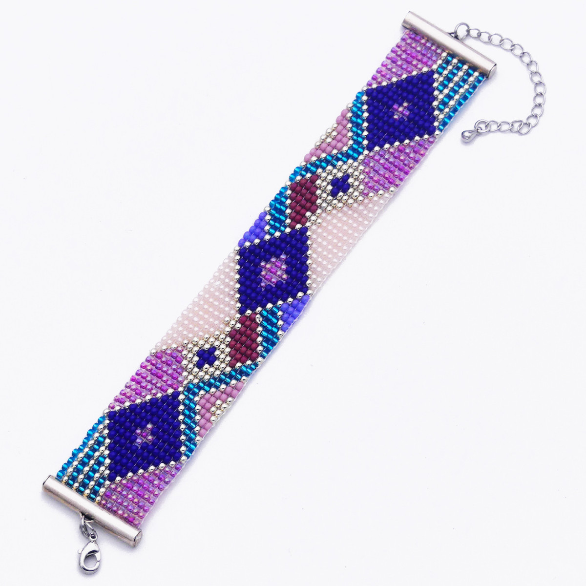 Bracelet tissé au métier à tisser en perles de verre "Miyuki" couleurs violet, bleu soutenu, bleu métallisé, fushia et rose clair. Le fermoir et la chaîne d'extension sont en acier inoxydable couleur argent.