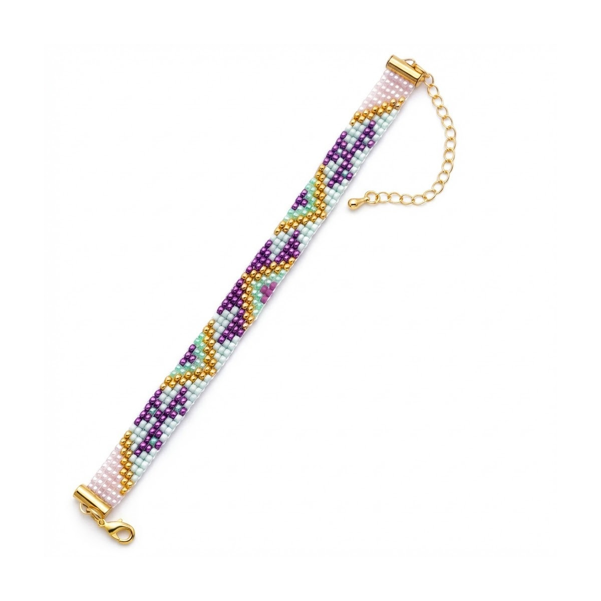 Bracelet tissé en perles Miyuki couleurs violet, vert bouteille, or et rose clair. Le fermoir et la chaîne d'extension sont en acier inoxydable couleur or.