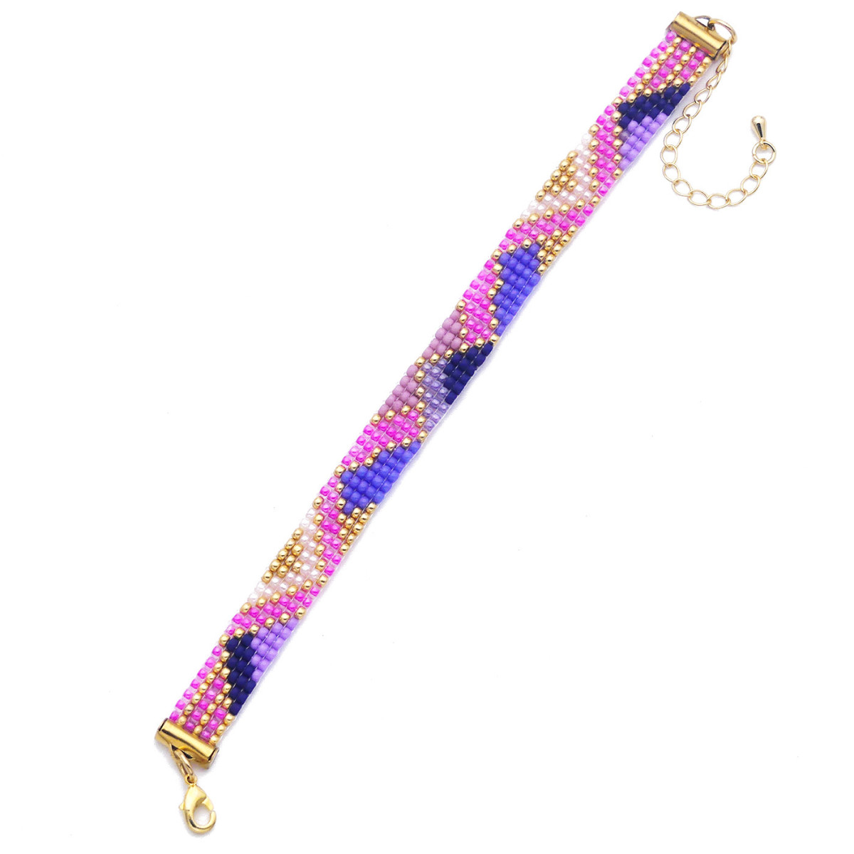 Bracelet composé au métier à tisser en perles de verre "Miyuki" couleurs rose, bleu, violet et or. Le fermoir et la chaîne d'extension sont en acier inoxydable couleur or.