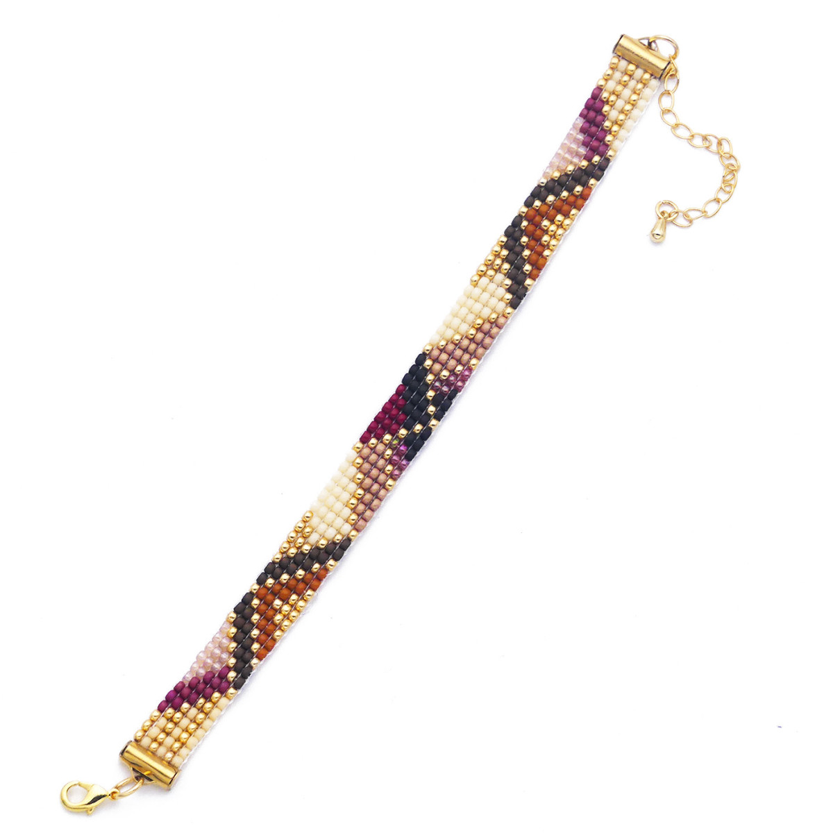 Bracelet créé au métier à tisser en perles de verre "Miyuki" couleurs violet, beige, rose, marron, gris sombre et doré. Le fermoir et la chaîne d'extension sont en acier inoxydable couleur or.