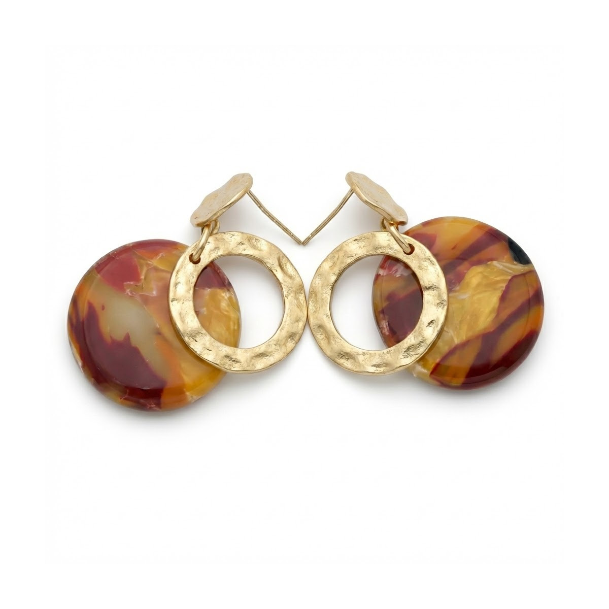 Boucles d'oreilles en polymère de forme ronde. Couleurs marron et mauve. Les cercles et les clous sont en acier inoxydable martelé.