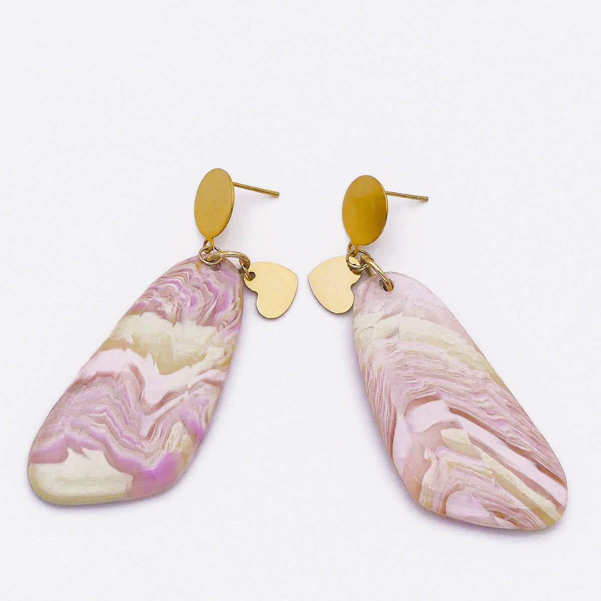 Boucles d'oreilles en polymère de forme allongée. Couleurs violet et beige. Les cœurs et les clous sont en acier inoxydable.