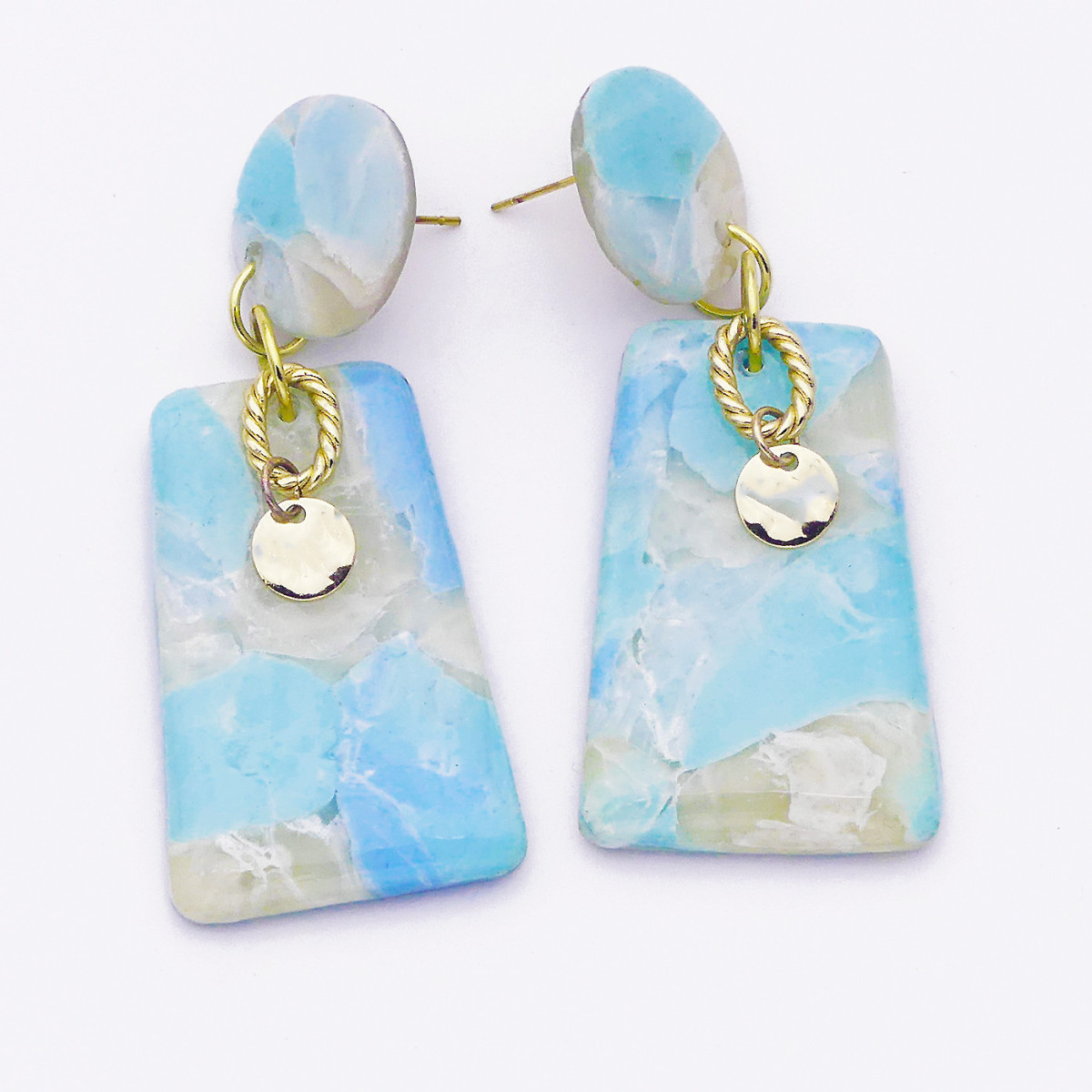 Boucles d'oreilles en polymère en deux partie (forme ronde et forme allongée). Couleur bleu turquoise. Les pampilles, les chaînes et les clous sont en acier inoxydable.