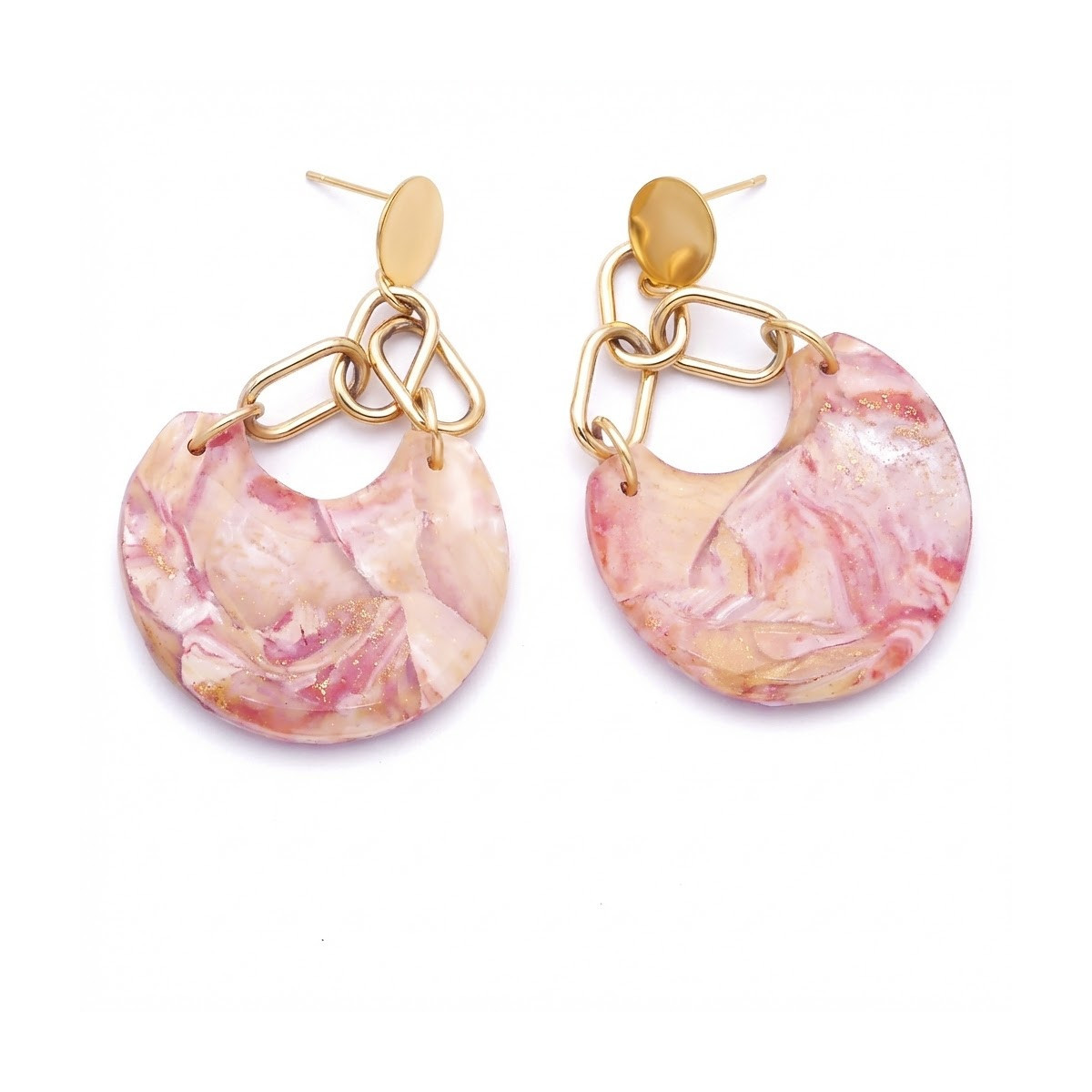 Boucles d'oreilles en polymère. Forme demi-lune. Couleurs rouge, rose-saumon et crême. Les chaînes et les clous sont en acier inoxydable.