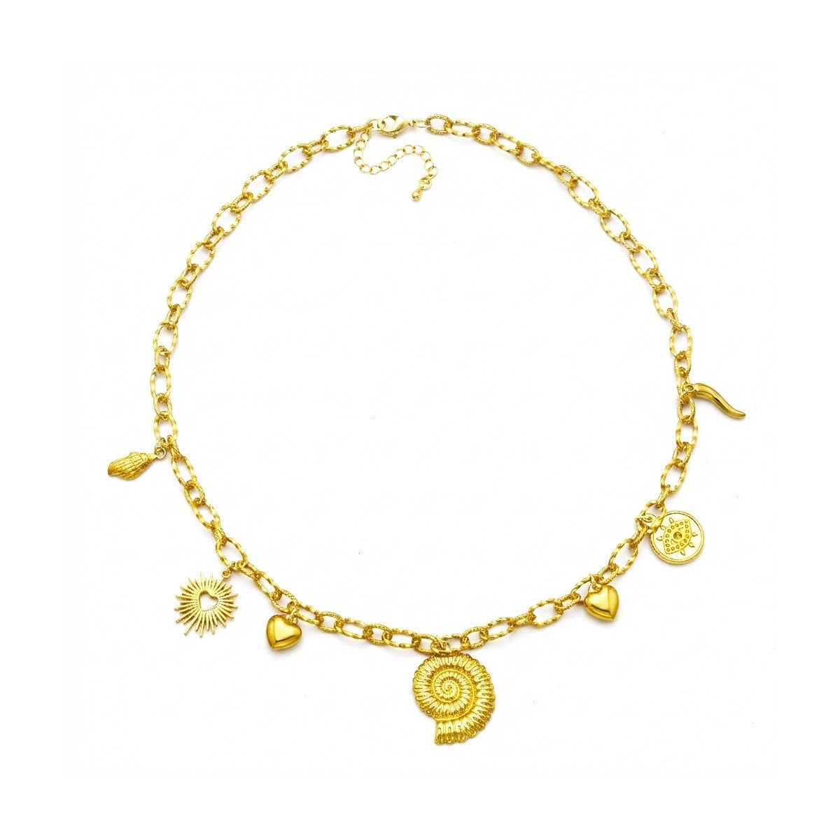 Collier "Charms" en acier inoxydable doré 750/1000ème avec 7 éléments : coquillage "Nautilus" (au centre), coquillage buccin, cœur rayonnant, deux cœurs simples, mauvais œil et piment italien.